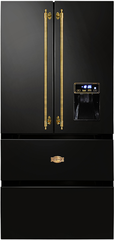 Холодильное отделение имеет три полки, две из них – регулируемые по высоте, два выдвижных бокса в зоне свежести и 6 дверных балконов – по три с каждой стороны. Морозильное отделение представлено двумя выдвижными камерами общей емкостью 183 литра. Холодильник оснащен диспенсером для холодной воды и ледогенератором для приготовления льда – колотого и кубиками (подключения к водопроводу не требуется).