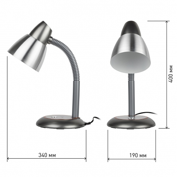 Устойчивое металлическое основание. Металлический плафон большого диаметра для комфортного рассеивания света. Наклон и поворот плафона в любом направлении.