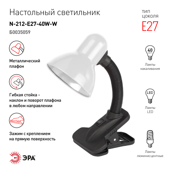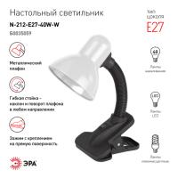 Лампа настольная ЭРА N-212 Е27-40W-W белая на прищепке