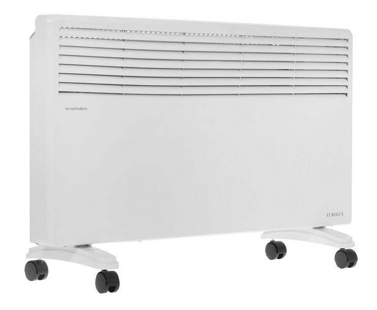 Конвектор Eurolux ОК-EU-2500 использует для своей работы монолитный (X-образный) нагревательный элемент, располагающийся в нижней части корпуса. Он быстро нагревается после включения прибора, обеспечивая плавное распространение теплого воздуха по комнате в процессе естественной конвекции. Разместить устройство можно как на полу при помощи комплектных ножек с колесиками, так и закрепить его на стене. При возникновении риска перегрева конвектор отключается автоматически, что значительно увеличивает срок его службы.